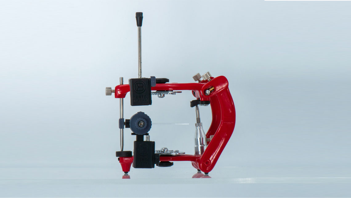 Il supporto scorre in una guida verticale fissata a lato dell’articolatore nella parte inferiore consentendo alla lastra di plexiglass di muoversi sul modello inferiore. Rispetto alla lastra il supporto può ruotare di 180° ed inserirsi nella guida verticale fissata nella parte superiore dell’articolatore, perfettamente allineata a quella inferiore, consentendo il movimento verticale sul modello superiore.